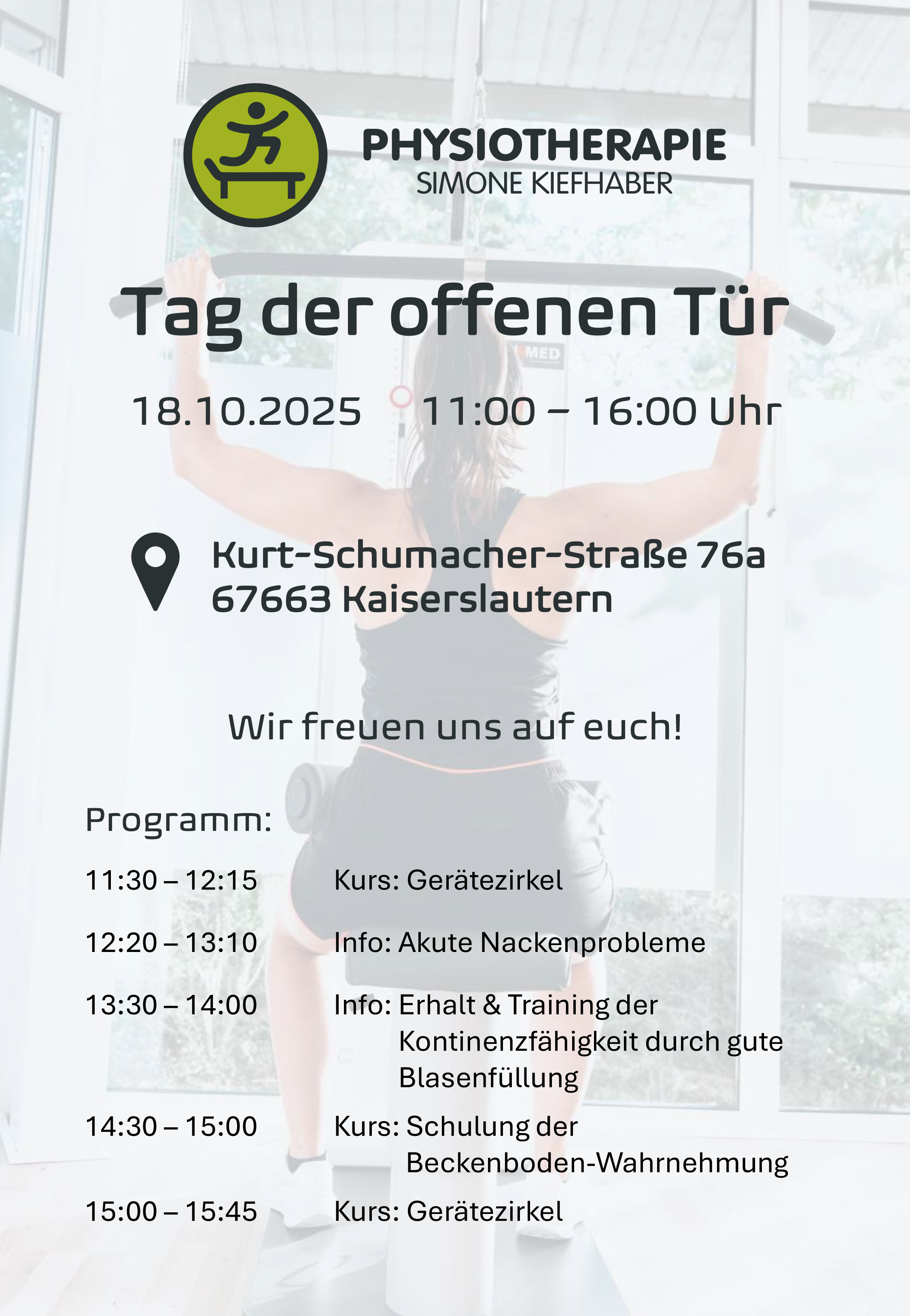 Du willst mehr über unsere Praxis erfahren, dir unsere neuen Räumlichkeiten anschauen und an spannenden Mitmachkursen und Vorträgen teilnehmen? - Dann komm zu unserem Tag der offenen Tür! Am Samstag, den 18.10.2025 öffnen wir unsere Türen für alle Interessierten. Wir freuen uns auf euch!